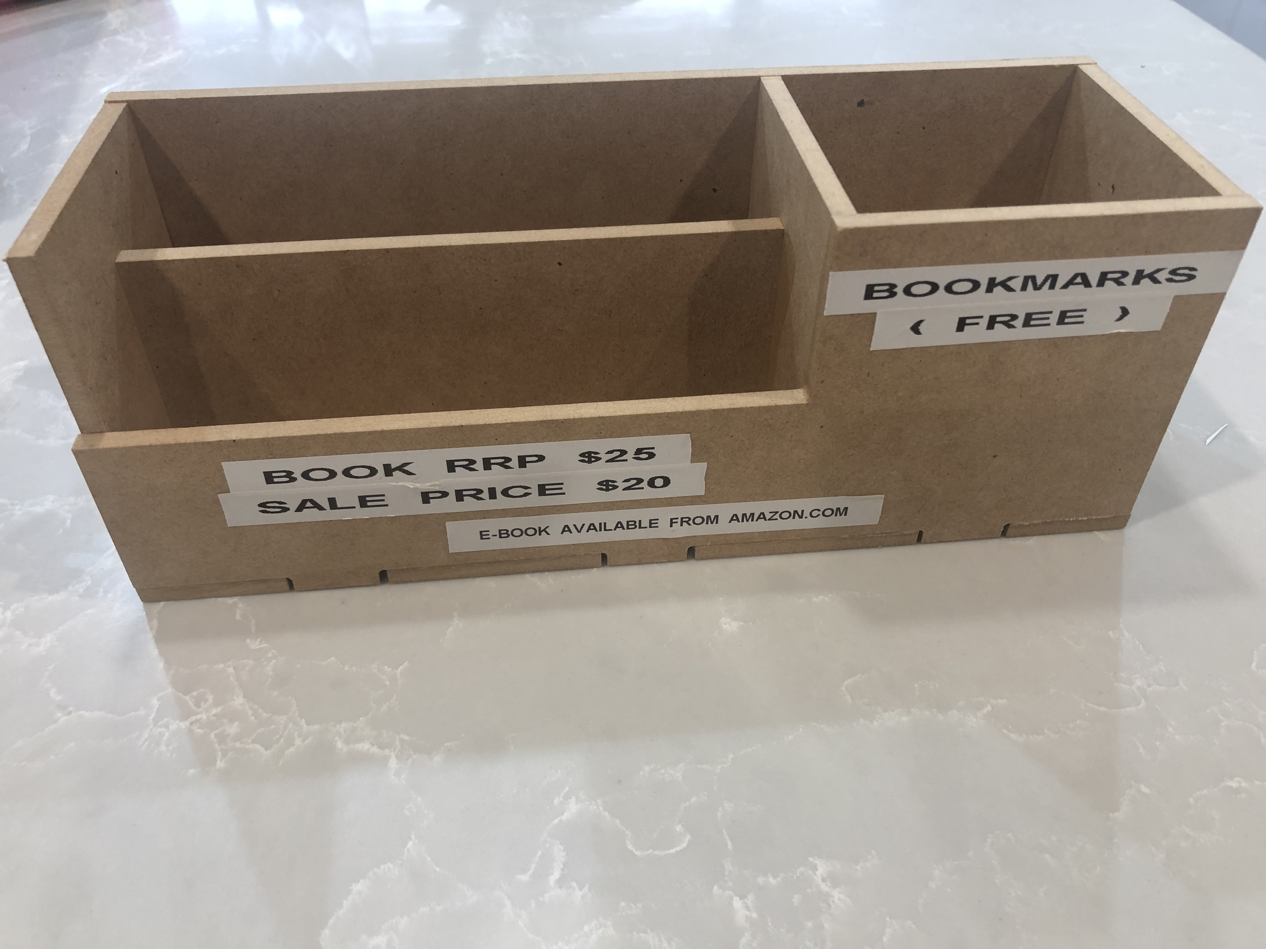 All it takes is to create a simple display such as the image above and below and the courage to ask your local shops to help an aspiring writer out. I bought a few desk organisers and repurposed them to sell books. On the back of each is my phone number so the shop owner can tell me when they’ve had enough of the display or to order more books. Remember if a shop does agree to help you out be grateful and courteous, you might need them again for your next book.