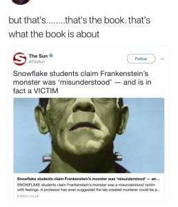 The image at the top of this page makes clear that the monster is a victim in the story, but people who haven’t read the book, from the bit of the story they have gleaned from popular culture, argue otherwise. The identification of who is the tragic figure and why intrigues me, mostly because I can’t get past the subtitle of the book.