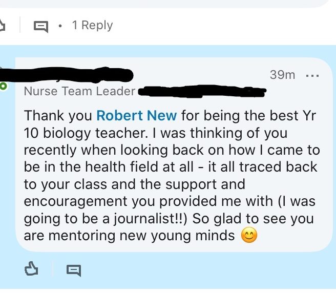 So what’s prompted this reflection? Well, recently, a student I taught as a neophyte teacher some 17 years ago informed me I’d changed their whole career path. While I had felt like I’d had a positive influence on that student’s learning at the time, I didn’t know I’d affected their life to this extent (and it was only a chance interaction which led to me knowing this now). Which goes to show that we all influence others in ways we might not anticipate. So thank you to the teachers out there who are making a positive difference, be it small or large.