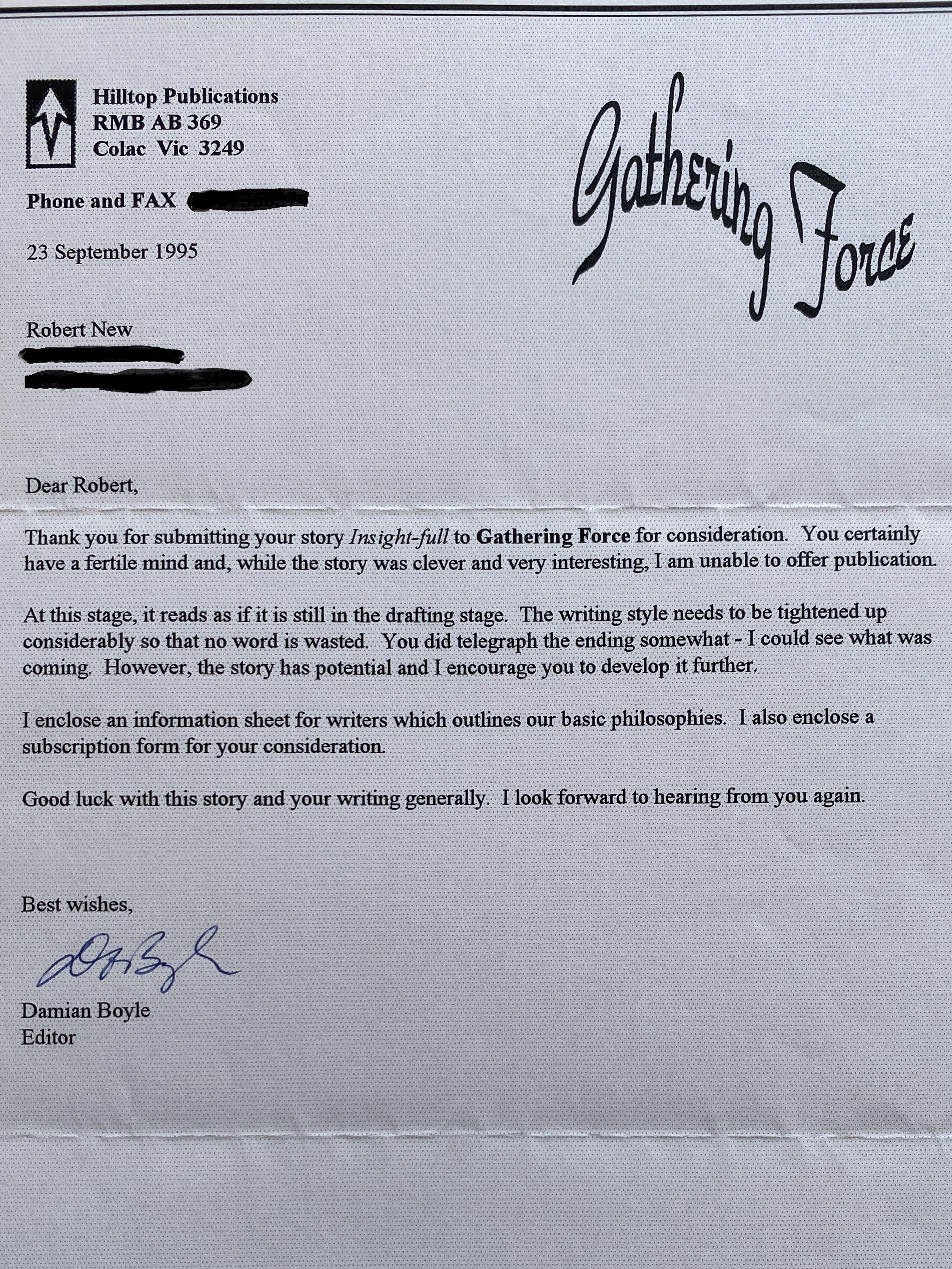 Below is the first rejection letter I received as a writer. As far as rejection letters go, it’s a good one. There is specific feedback on the story and it’s personalised. It’s even hand signed. All of which is a rarity in modern times. However, it’s the story behind how I came to receive it, which makes it more valuable to me than my first acceptance letter (which didn’t come until much, much later).